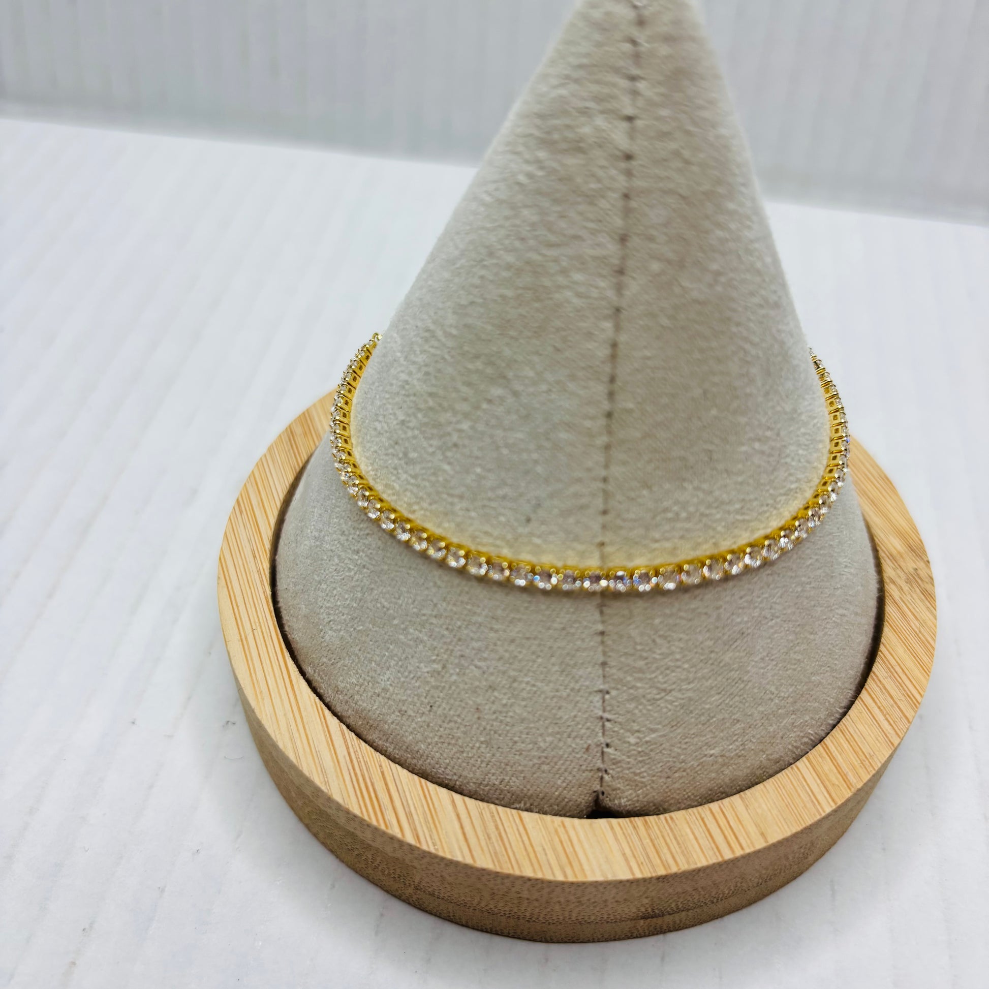 This bracelet features a continuous line of shimmering, clear cubic zirconia (CZ) stones, all set in a brilliant gold-tone setting. The stones catch the light beautifully, giving the look of real diamonds without the hefty price tag.