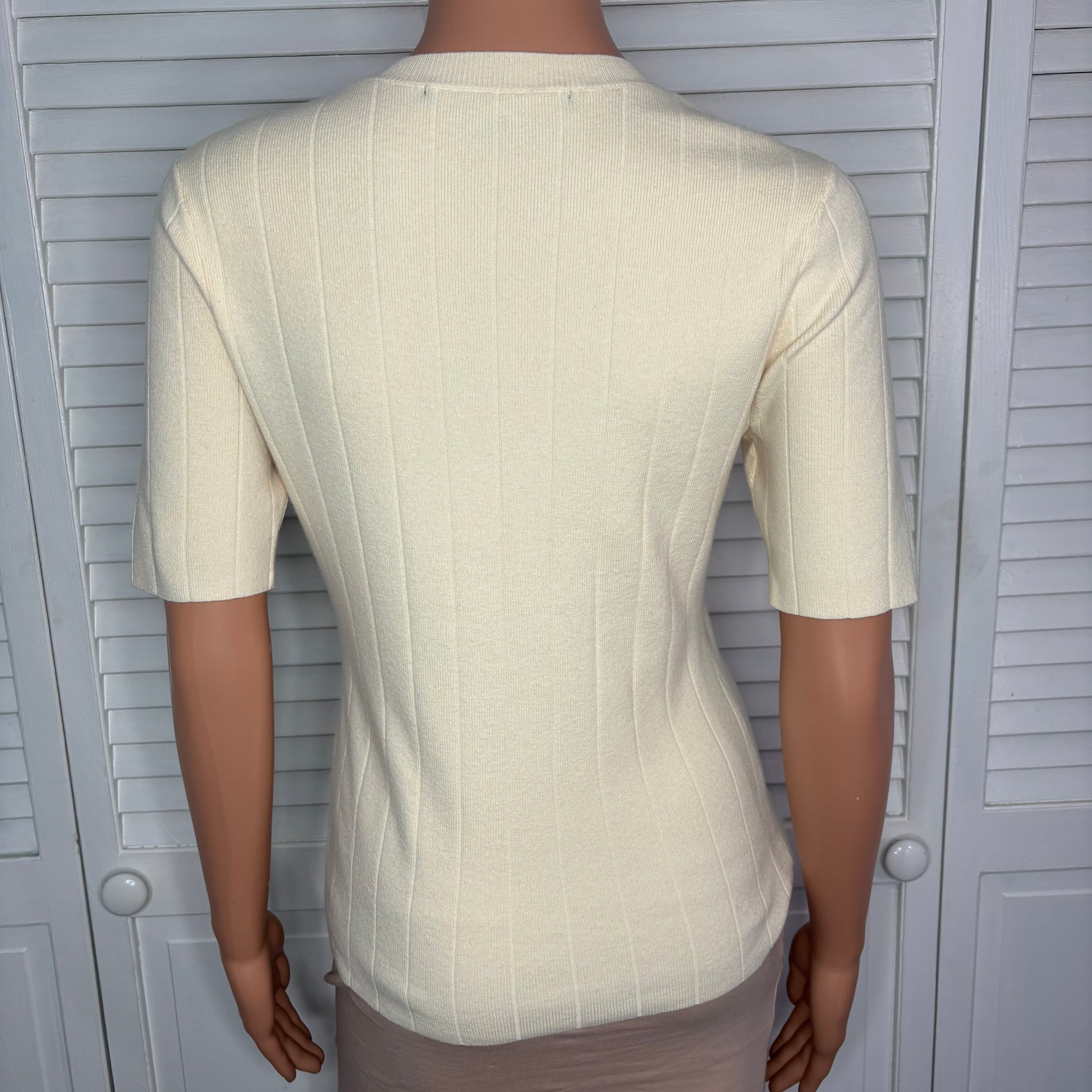 * Features: Crew neck, short sleeves, vertical wide-ribbed knit, stretchy but holds shape.