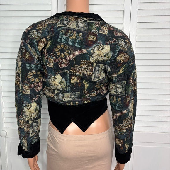 •Style: Vintage-inspired, structured, cropped jacket with a unique statement print.