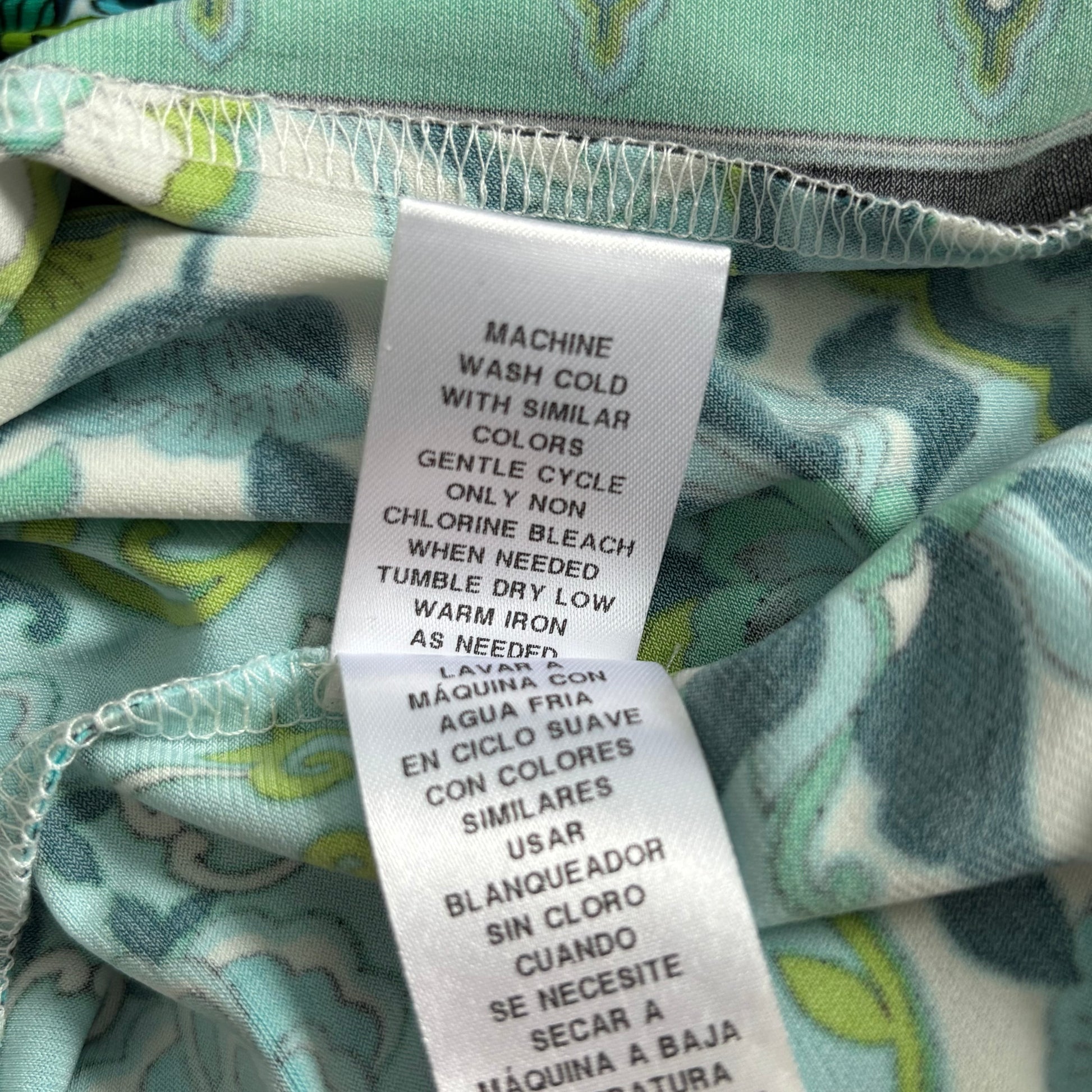 * Print: Intricate Mediterranean-style paisley and floral "border" print in shades of teal, lime green, navy, and white.