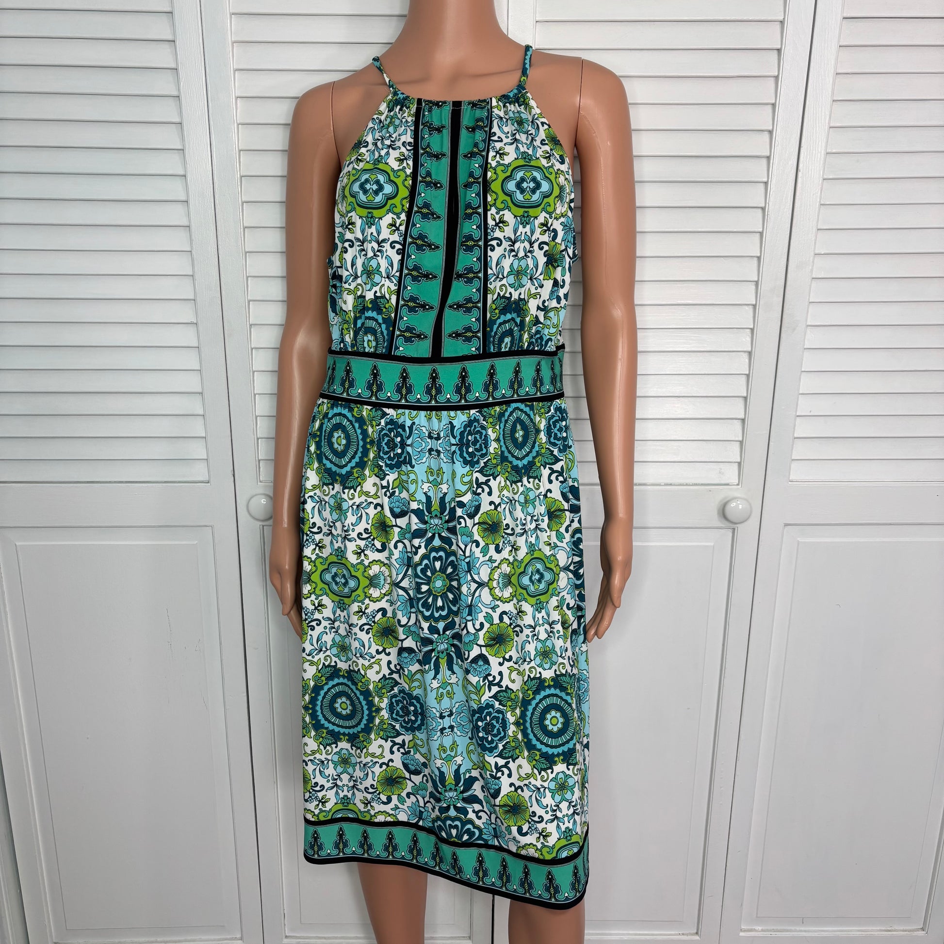 Excellent Pre-Owned LONDON TIMES Turquoise Abstract Print Halter Dress Size 12, MSRP: $110