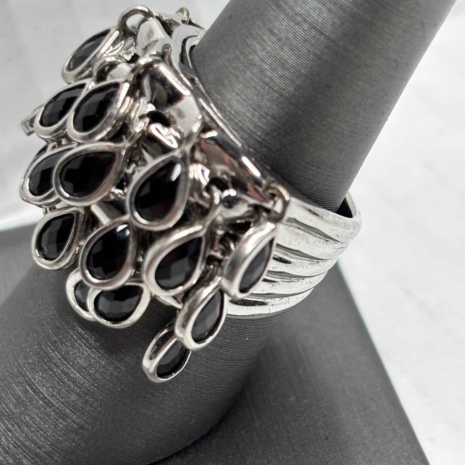 Elevate your jewelry collection with this stunning, high-drama piece from renowned designer Michael Valitutti. This "shaker" style ring features a cluster of faceted black teardrop dangles that move with you, catching the light from every angle. This isn't just a ring; it's a conversation starter. The contrast between the polished silver and the deep black stones makes it perfect for evening wear or adding a gothic-chic touch to your daily outfit. The intricate gallery work on the band is a signature of Valitutti’s craftsmanship.