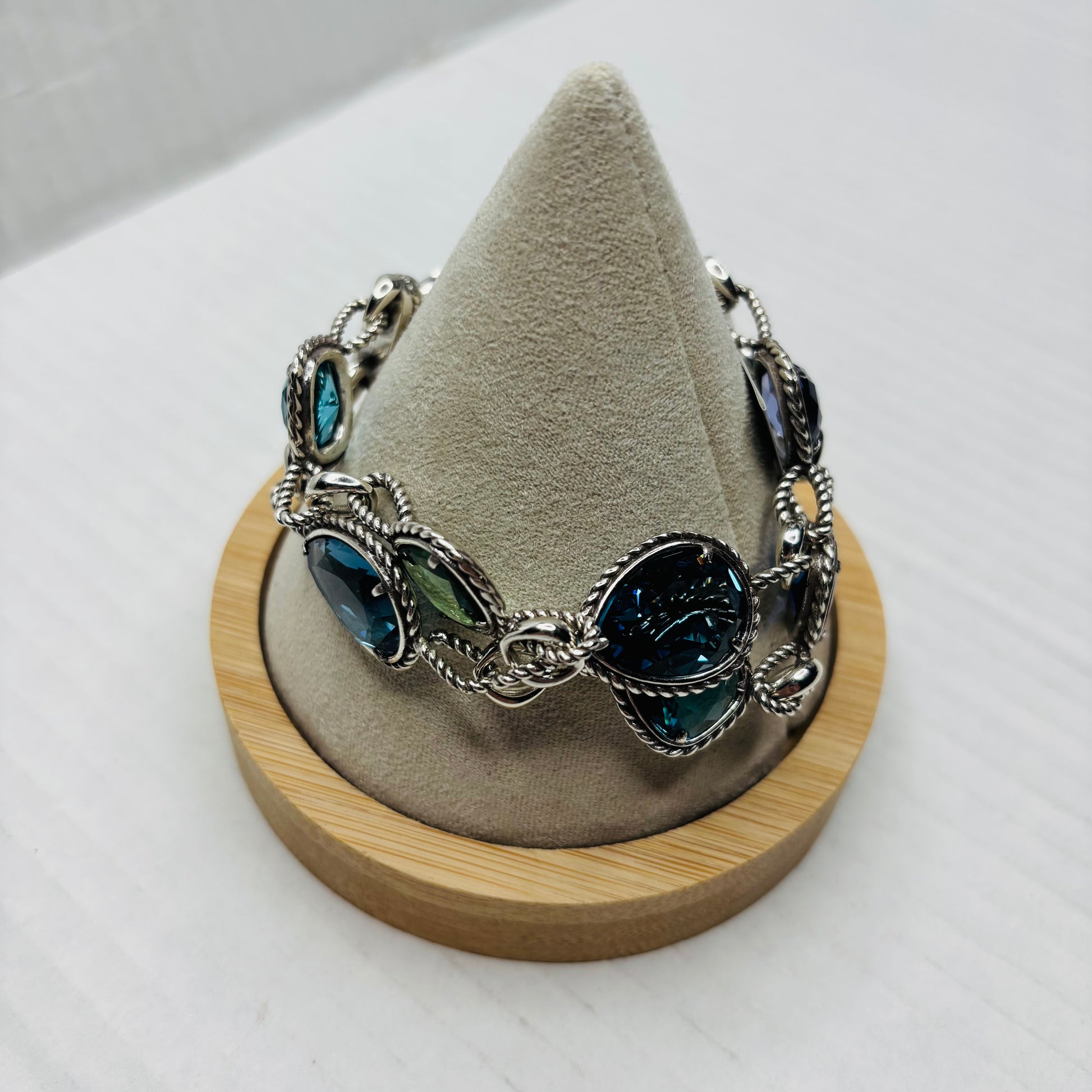 • Color: Silver with multi-color blue, green, and purple stones.