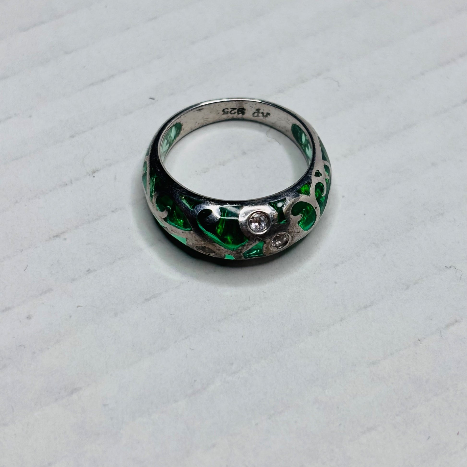 Details: Vintage Sterling Silver Green Glass and Diamonique Stone Ring Size 8
