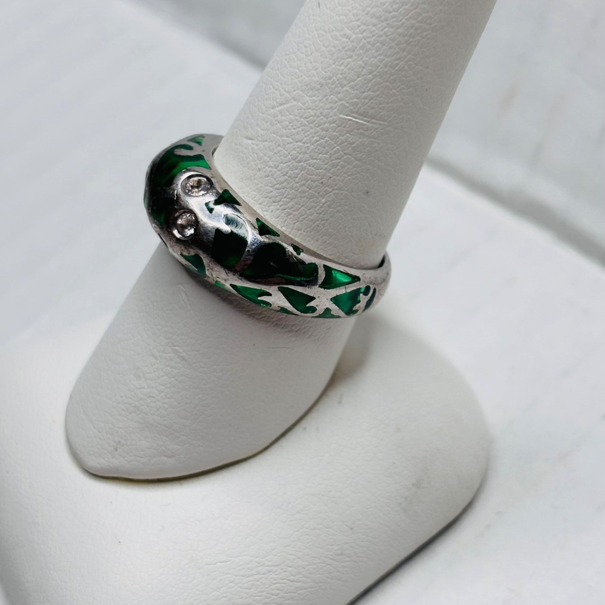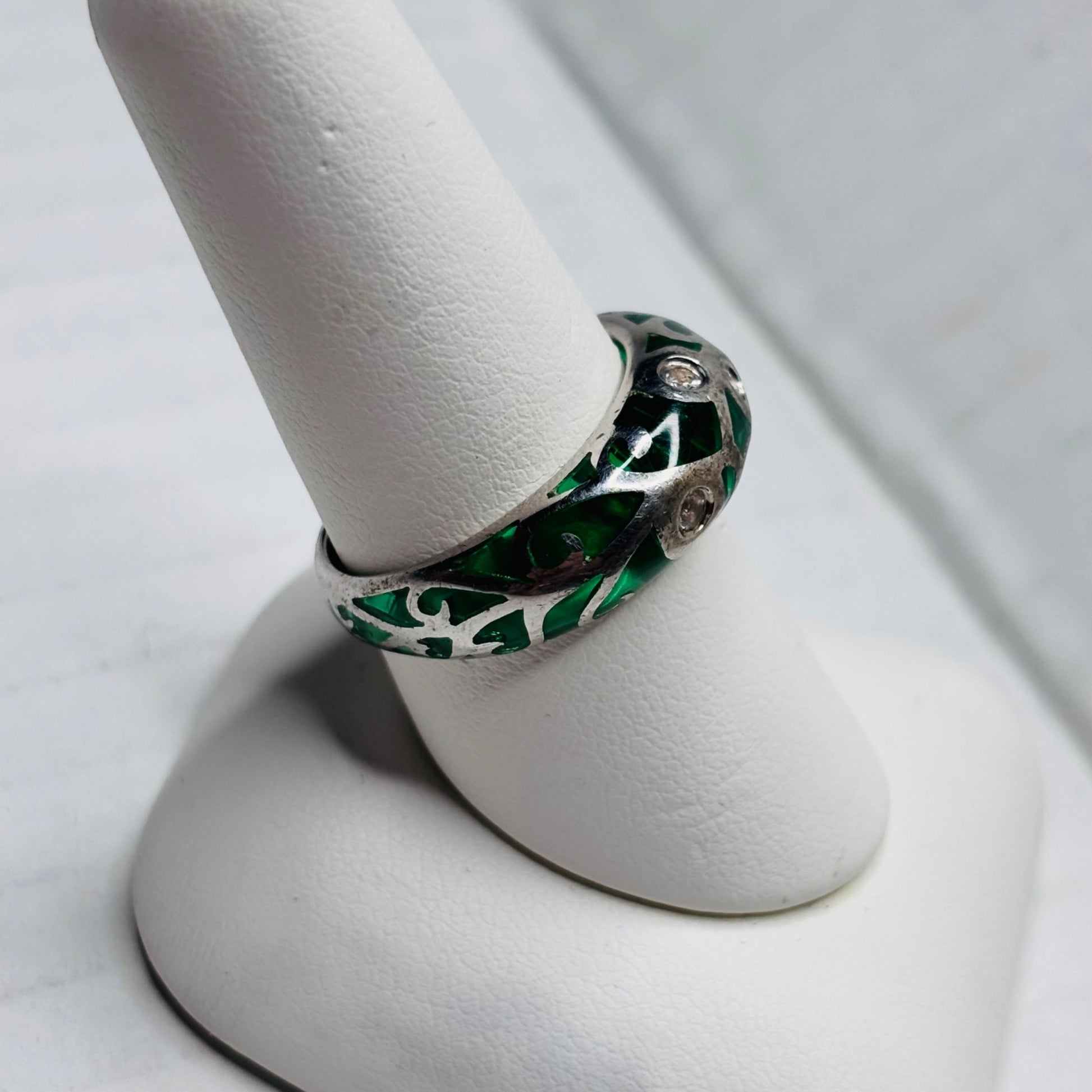 Vintage Sterling Silver Green Glass and Diamonique Stone Ring Size 8