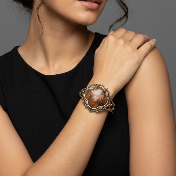 Stunning Studio Barse Thailand Brecciated Jasper Statement Cuff. Elevate your jewelry collection with this bold, artisan-crafted cuff from Studio Barse. Originally featured on HSN, this piece combines intricate metalwork with the raw beauty of natural stone.